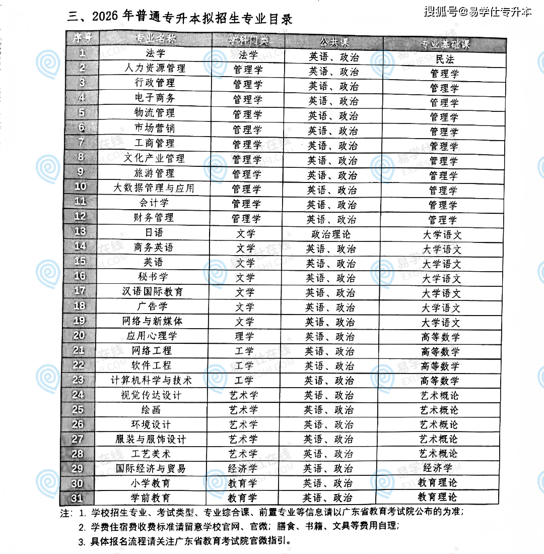2026年通俗专升本(统考)拟招生专业共32个。广东科技学院、广东工商职业手艺大学、湛江科技学院、珠海科技学院、广东软件学院等院校已发布2026年通俗专升本拟招生专业。无增减。2026年通俗专升本(通俗批)拟招生专业共27个。